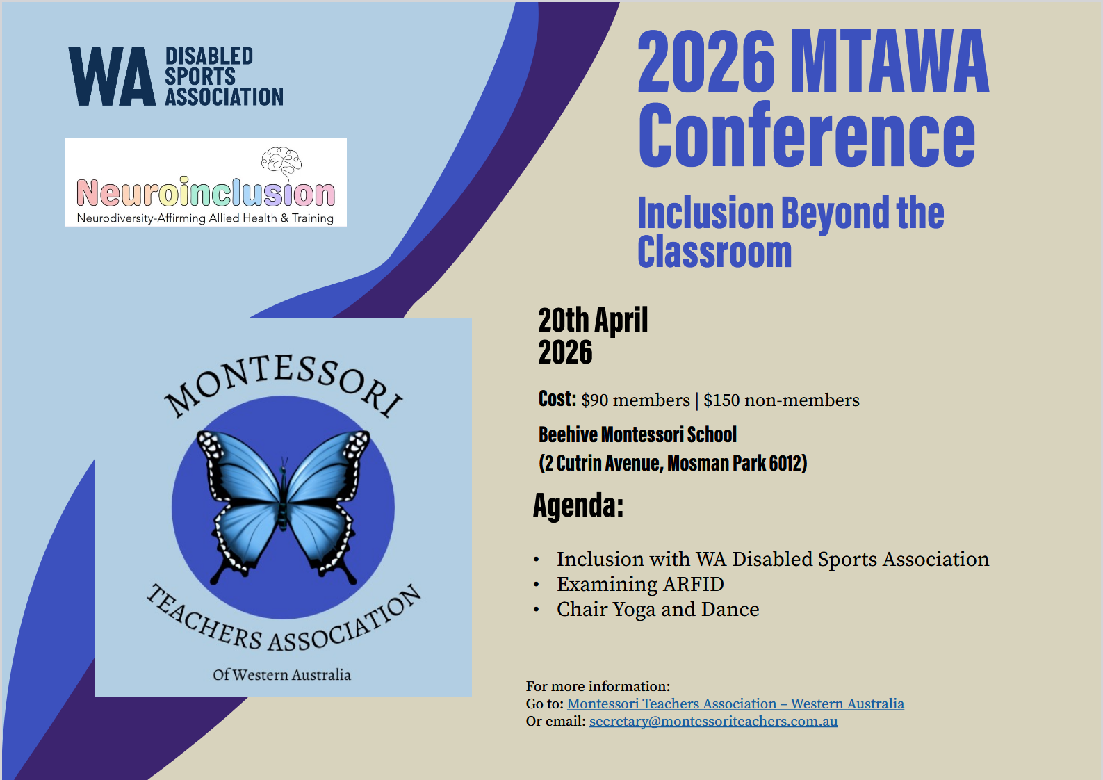 The Montessori Teachers Association (Western Australia Conference is on 20th April 20256. This is an all-day event and will be held in Mosman Park at Beehive Montessori School.